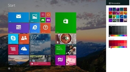 在Windows 8.1中,你不仅可以更自由地改变瓷砖大小和排列方式,甚至还能够为瓷砖设置颜色,并且自定义背景,至少让Modern UI看上去不那么乏味了。