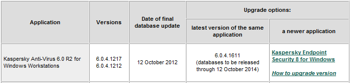 现在还包括卡巴斯基病毒防护6.0 MP4(6.0.4.1212/6.0.4.1217)这两个版本的生命周期同样即将结束