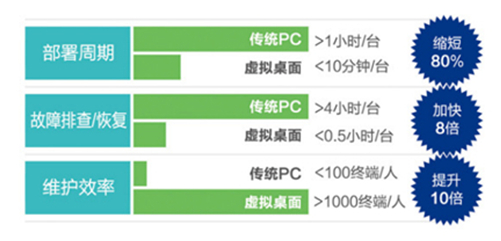 深信服桌面云可以做到 足够高效,某集团公司计划部署桌面云给100多用户使用。整个桌面云后台搭建只用了1天时间,第二天便将系统模板调试和用户信息导入完成,最后用了半天进行瘦终端和账号信息的分发,整个桌面云从搭建到上线只用了2.5个工作日就完成了。